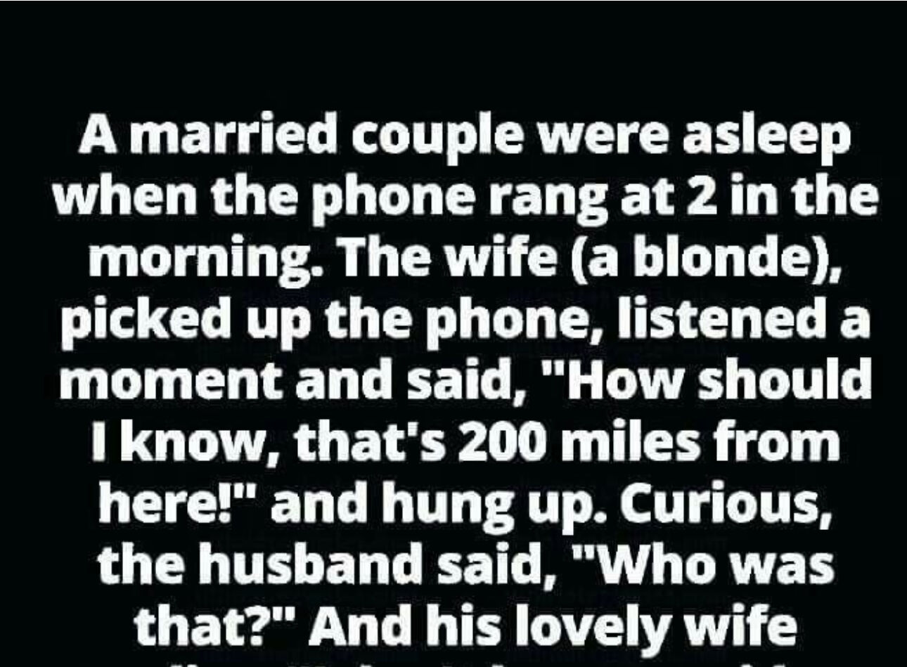 A married couple were asleep when the phone rang at 2 in the morning.The wife (a blonde) picked up the phone, listened for a moment, and said,“How should I know? That’s 200 miles from here!” and hung up. Curious, the husband said, “Who was that?”And his lovely wife replies,…. “Late-Night Phone Call Leaves Husband and Wife in Hysterics!”….