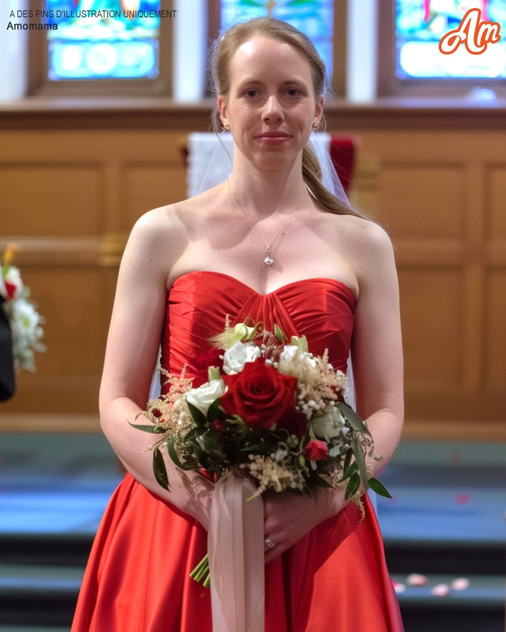 A bride entering a church in a red wedding dress | Source: Midjourney